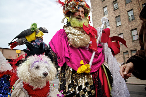 East Harlem residents watch a giant puppet of the king Melchor pass by.