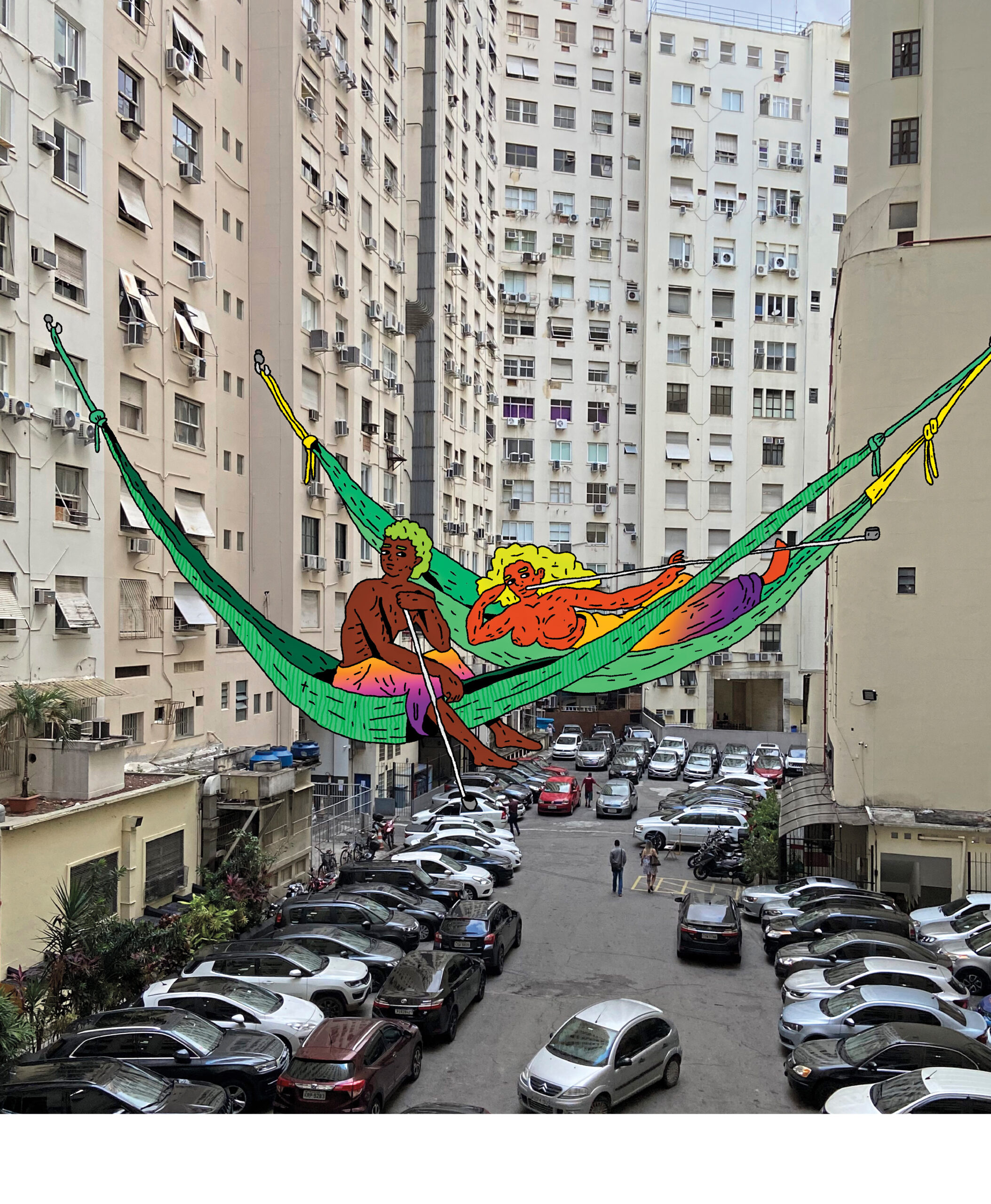 In Sara Flores’ textiles, geometric lines curve around and into each other like gnarled tree branches or the lines on a subway map. In Sheroanawe Hakihiiwe’s cotton-paper books, colorful snakes twirl around leaves in whimsical S-shapes. PV Dias takes a different approach, overlaying digital paintings of Amazonian objects and people onto photos of urban centers to highlight the tensions between the two sites.