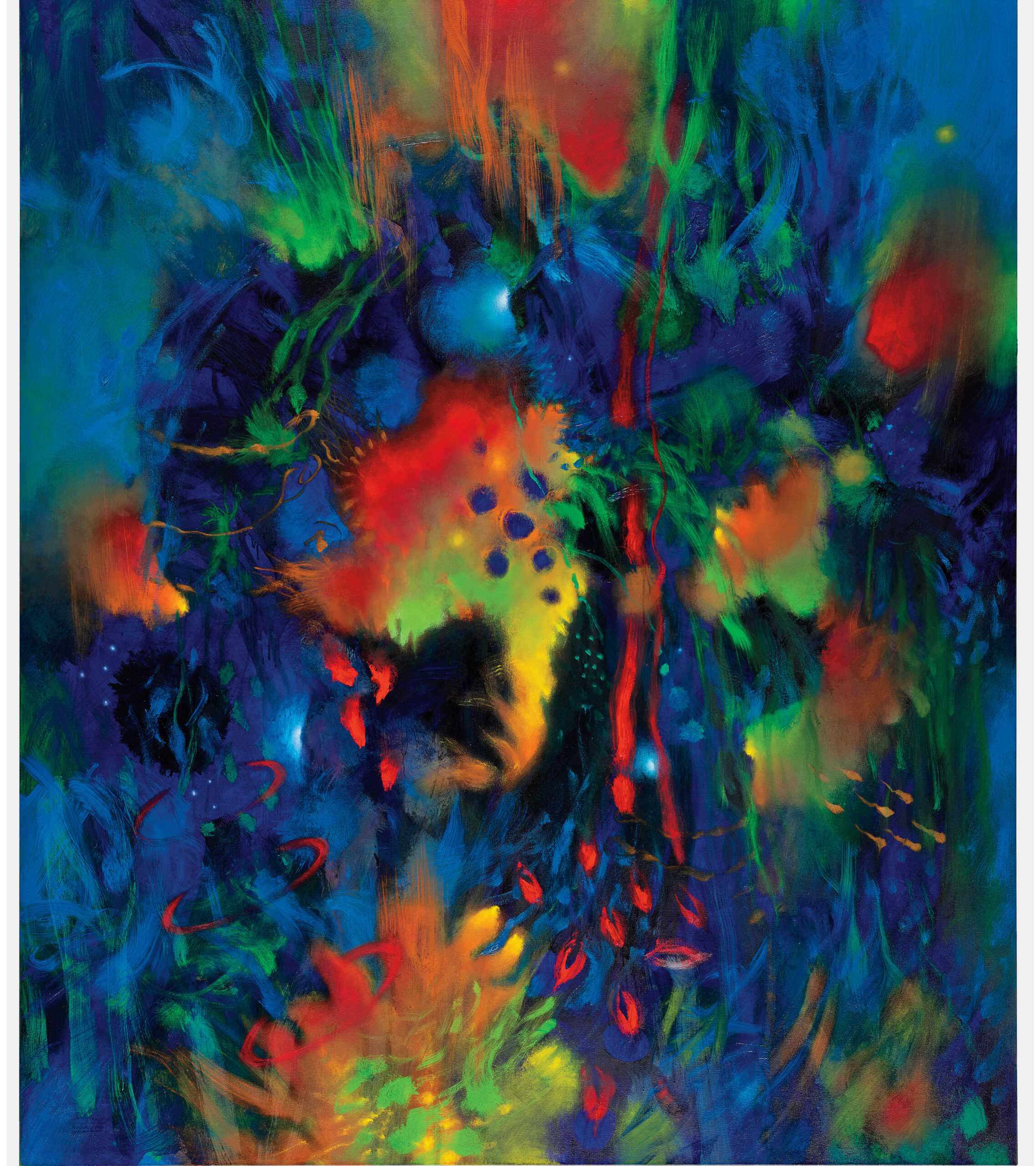 Left: Headdress by the Boe people of the Brazilian Amazon, on view at the Musée du quai Branly - Jacques Chirac. Right: Pablo Amaringo, "El baile de los Puca-bufeos," 2009, on view at Americas Society.