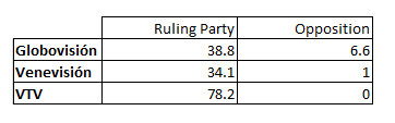 All three stations devoted far more time to government electoral campaigns than to the opposition’s (see Table 1). VTV in particular gave zero time to covering the opposition’s campaign.